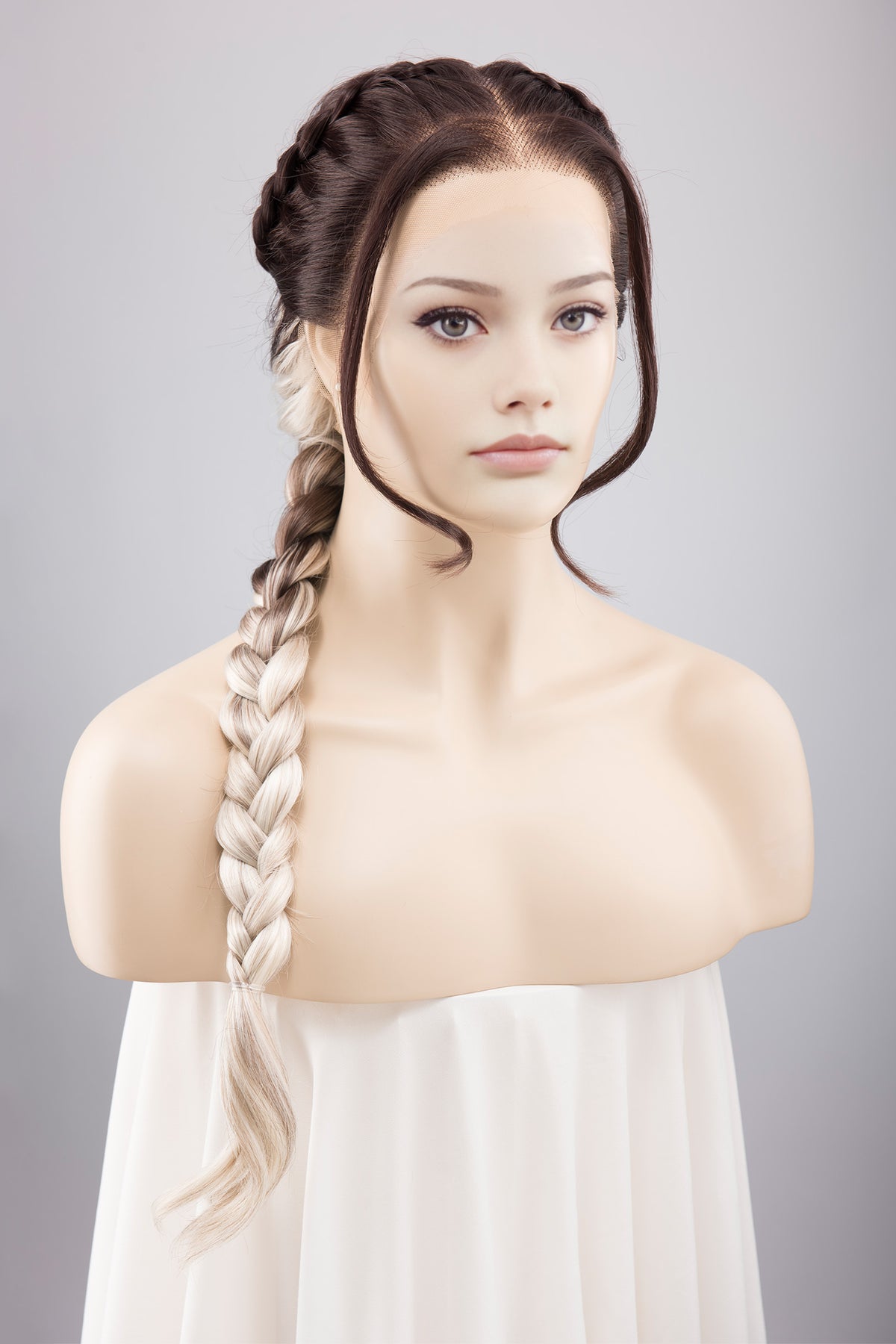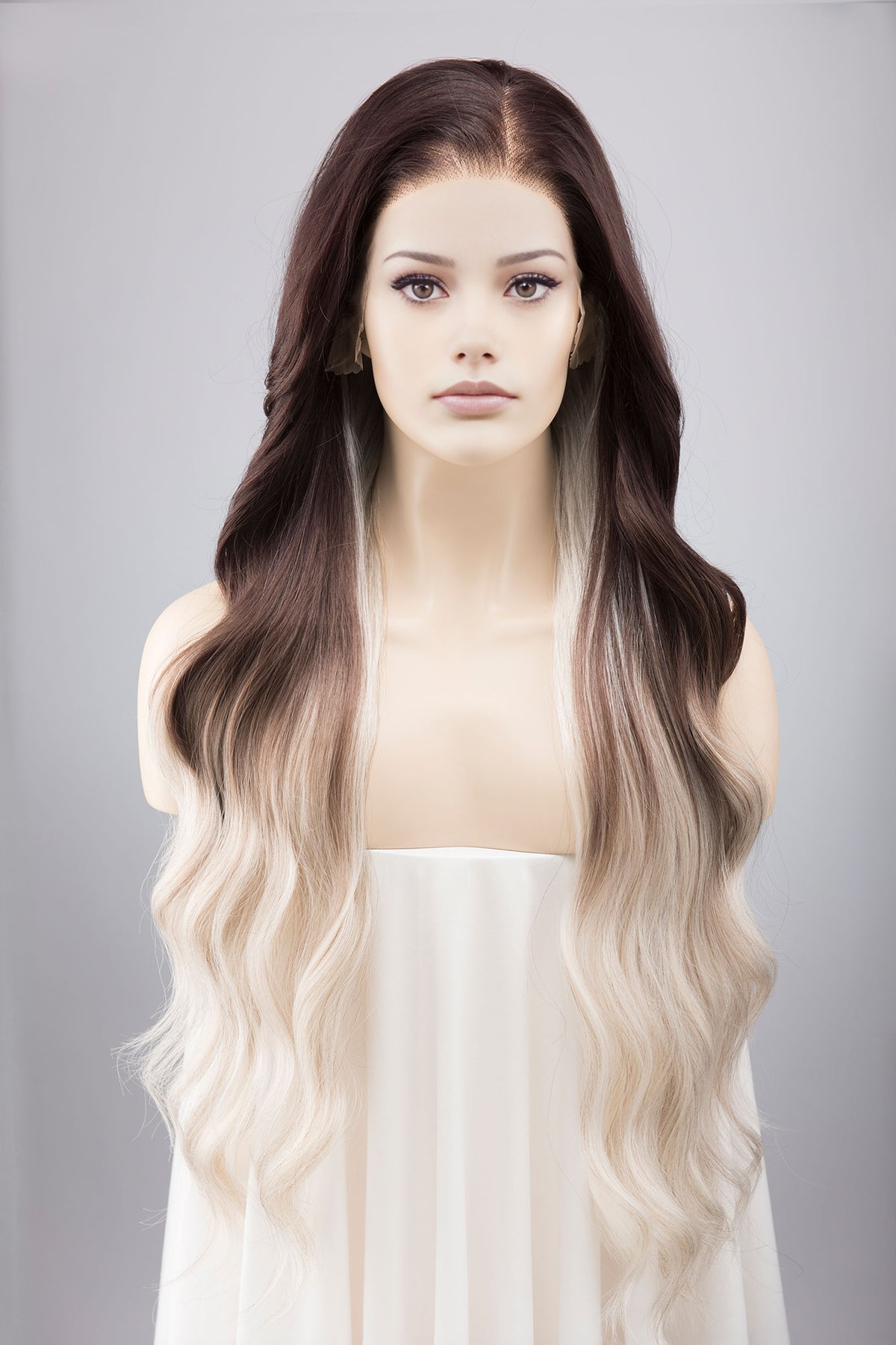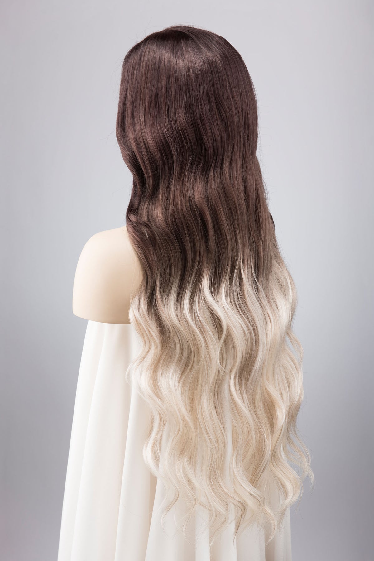 Experience the ethereal allure of the Pearl White Long Wavy Ombre Lace Front Wig, blending seamlessly into silver gray hues. It is perfect for the look of Violet Sorrengail from the Fouth Wing. At a majestic 26" long in length, the wavy texture flows like a shimmering cascade, reminiscent of moonlit waves. The 13" X 6" lace free part gives you the freedom to choose how and where you part, allowing for versatile styling options.
